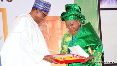 President Muhammadu Buhari presenting a Post-Humus GCON Award to Mrs Bukola Fawehinmi, wife of late civil rights activist, Chief Gani Fawehinmi, during a Special National Honours Investiture at the Presidential Villa in Abuja on Tuesday (12/6/18) 03139/12/6/2018/Callistus Ewelike/BJO/NAN